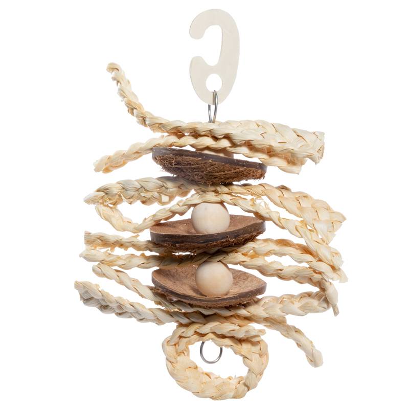 Игрушка NATURAL для птиц выполнена в виде подвески из натуральных материалов: косичек из листьев кукурузы, кокосовых пластин и деревянных шариков. Преимущества: Крепление: деревянный крючок. Размер: 330/360*140мм.