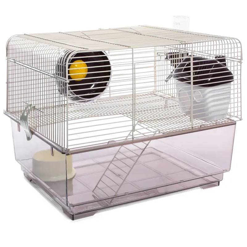 - В комплектацию также входят: пластиковая миска, поилка, уютный домик на втором этаже, беговое колесо и лесенка на 2-й этаж.