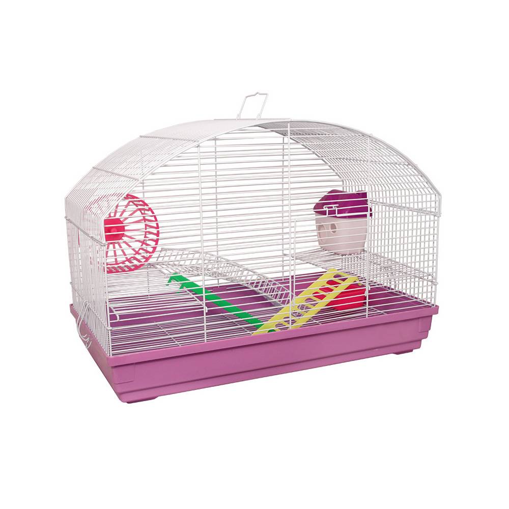 Клетка прямоугольной формы с округлой крышей - удобный и функциональный дом для любого грызуна: он занимает совсем немного места и отлично подходит для мелких домашних животных вроде крыс, мышей и хомяков. В комплектацию изделия также входят: пластиковая миска, уютный домик, беговое колесо и две пластиковые лесенки. Кроме того, клетка оборудована удобной ручкой на крыше, облегчающей процесс переноски изделия, и специальным пластиковым наружным поддоном, облегчающим процесс уборки.