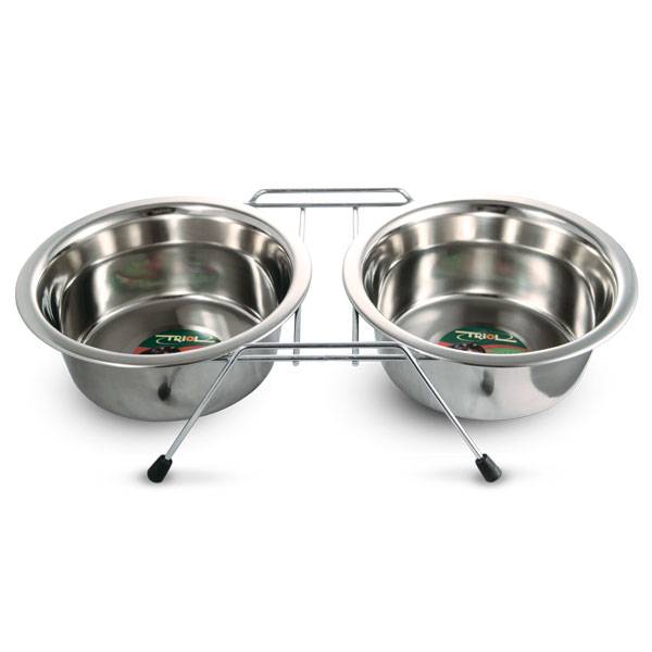Функциональный комплект из двух универсальных круглых мисок для собак на подставке выполнен из нержавеющей стали высокого качества.