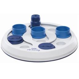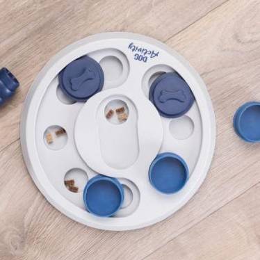 На основании предусмотрены 4 отделения с двигающимися элементами-колпачками, под которыми можно спрятать лакомство. Отодвигая и сбрасывая лапками колпачки собака получает угощение в награду!