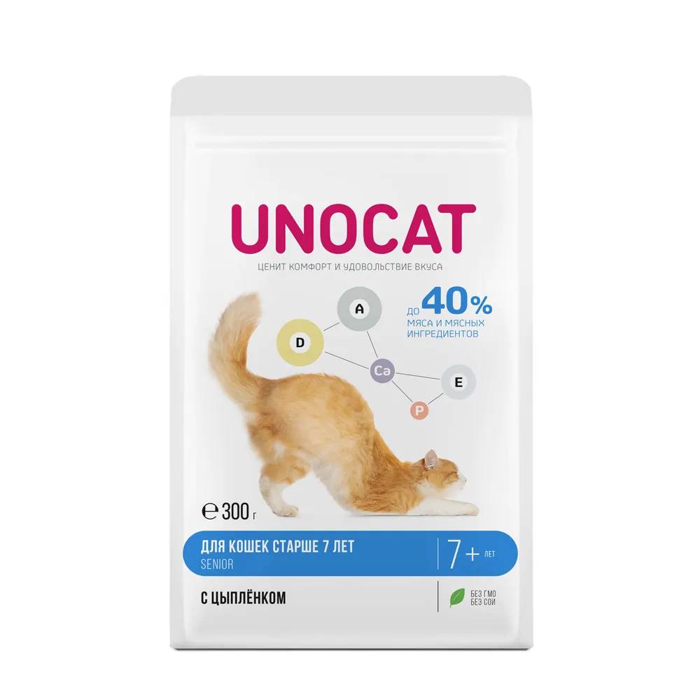UNOCAT с цыплёнком для кошек, которые ценят комфорт и наслаждаются вкусом корма. Аппетитный и вкусный, он богат всеми незаменимыми веществами для поддержания здоровья кошек старше 7 лет.