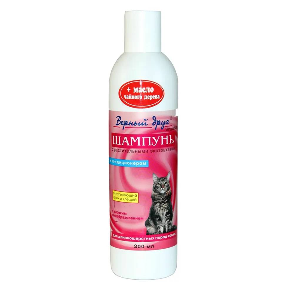Защитное действие до 3 дней. Шампунь отпугивающий блох для кошек длинношерстных 300 мл производства Верный Друг способствует безопасному очищению шерстяного покрова, и, в то же время, обладает возможностью защищать от заражения кожными паразитами.
