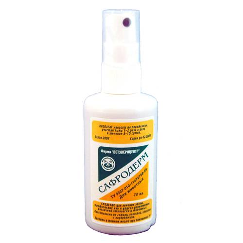 Сафродерм спрей 70 мл от фирмы ВЕТЗВЕРОЦЕНТР производится из натуральных компонентов. Гомеопатический препарат способствует антисептическим, ранозаживляющим, кровоостанавливающим свойствам. Эффективно воздействует на регенерацию тканей при различных повреждениях. Применяется для домашних питомцев, не вызывает аллергических реакций.