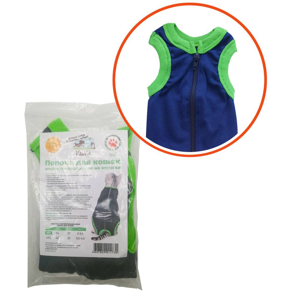 Послеоперационная попона VitaVet для кошек на молнии является неотъемлемой частью реабилитационного периода животных, в том числе после полостных операций. Попона рассчитана на кошек 2–3,5 кг и является отличным послеоперационным фиксатором.