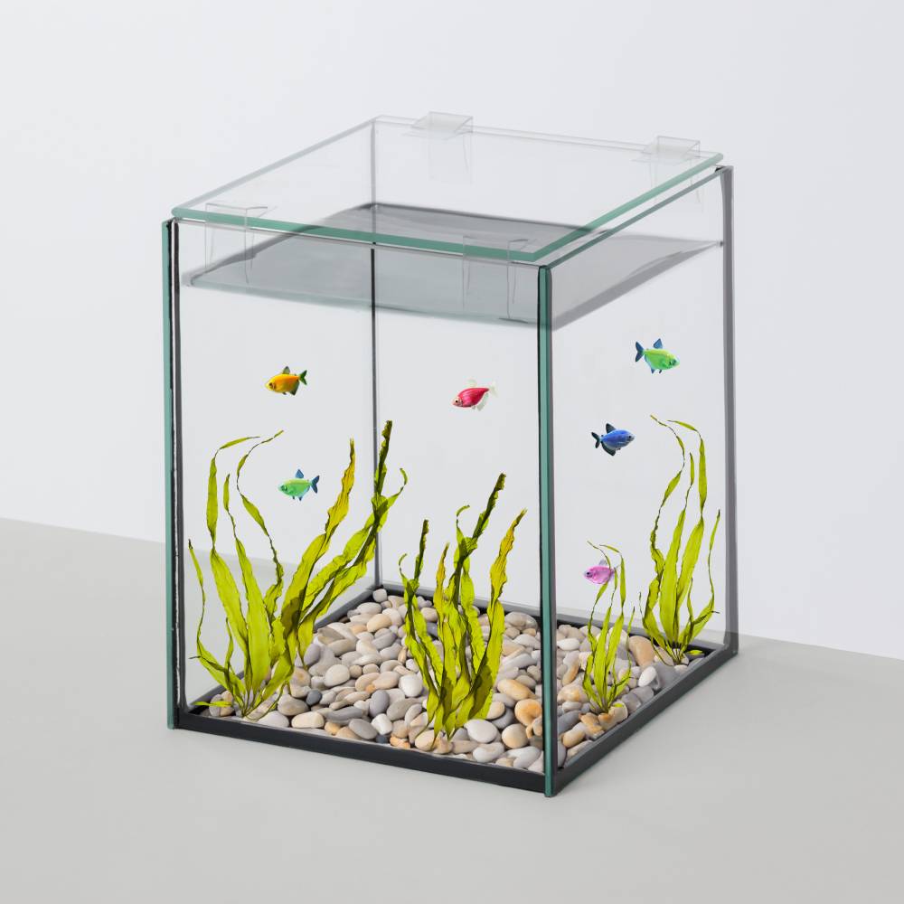 Установите аквариум на подложку-коврик, затем установите уголки, которые есть в комплекте, на покровное стекло. Опустите покровное стекло на аквариум.