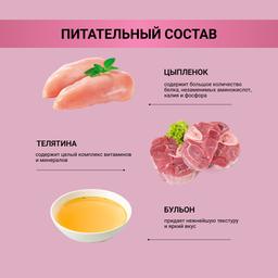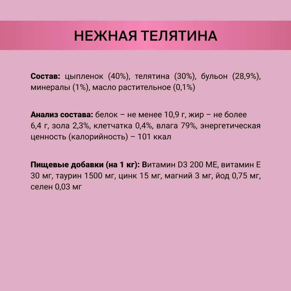цыпленок (40%), телятина (30%), бульон (28,9%), минералы (1%), масло растительное (0,1%).