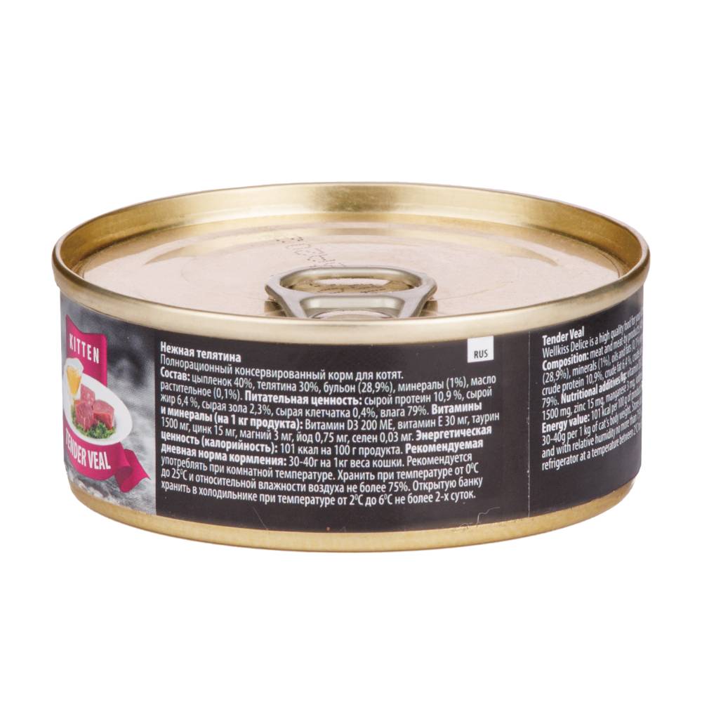 Корм для котят Wellkiss Delice нежная телятина — полноценный консервированный корм для котят на основе натурального мяса. Корм содержит всё необходимые витамины и микроэлементы для полноценного развития и роста вашего маленького питомца.