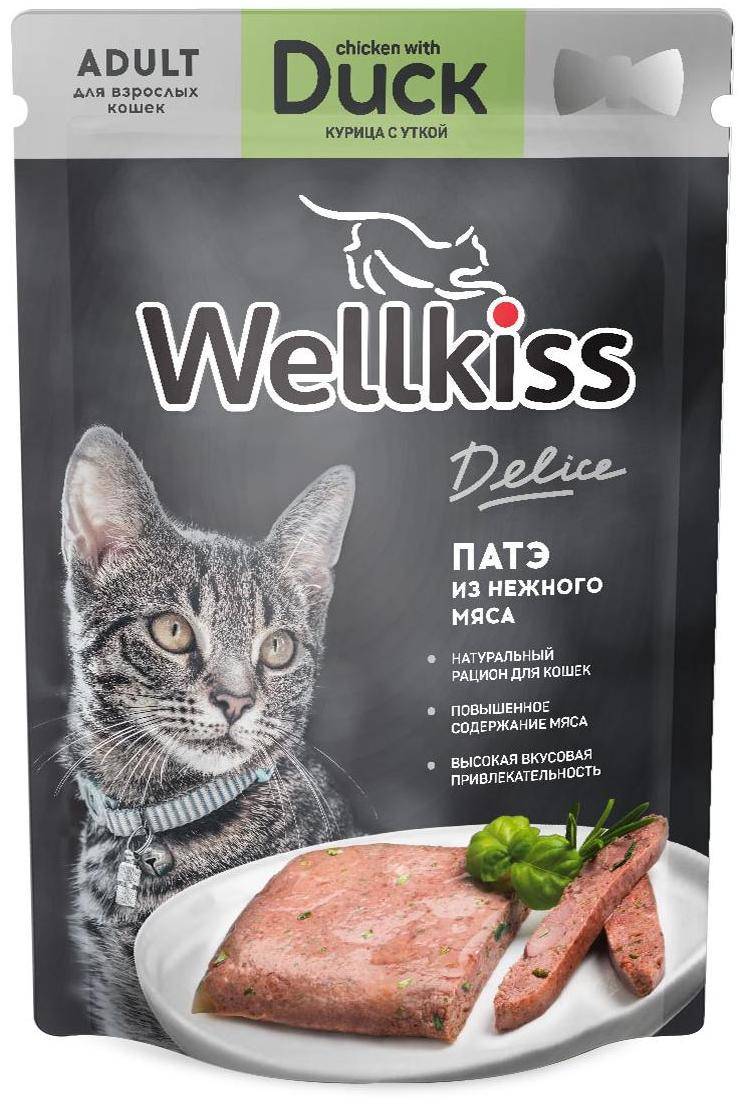Главный принцип влажного корма Wellkiss Delice – натуральный рацион для кошек, который содержит животный белок высокого качества со степенью усвоения более 90%. Сочетание вкусов курицы, утки и кролика обладает высокой вкусовой привлекательностью, и с удовольствием поедается кошками.