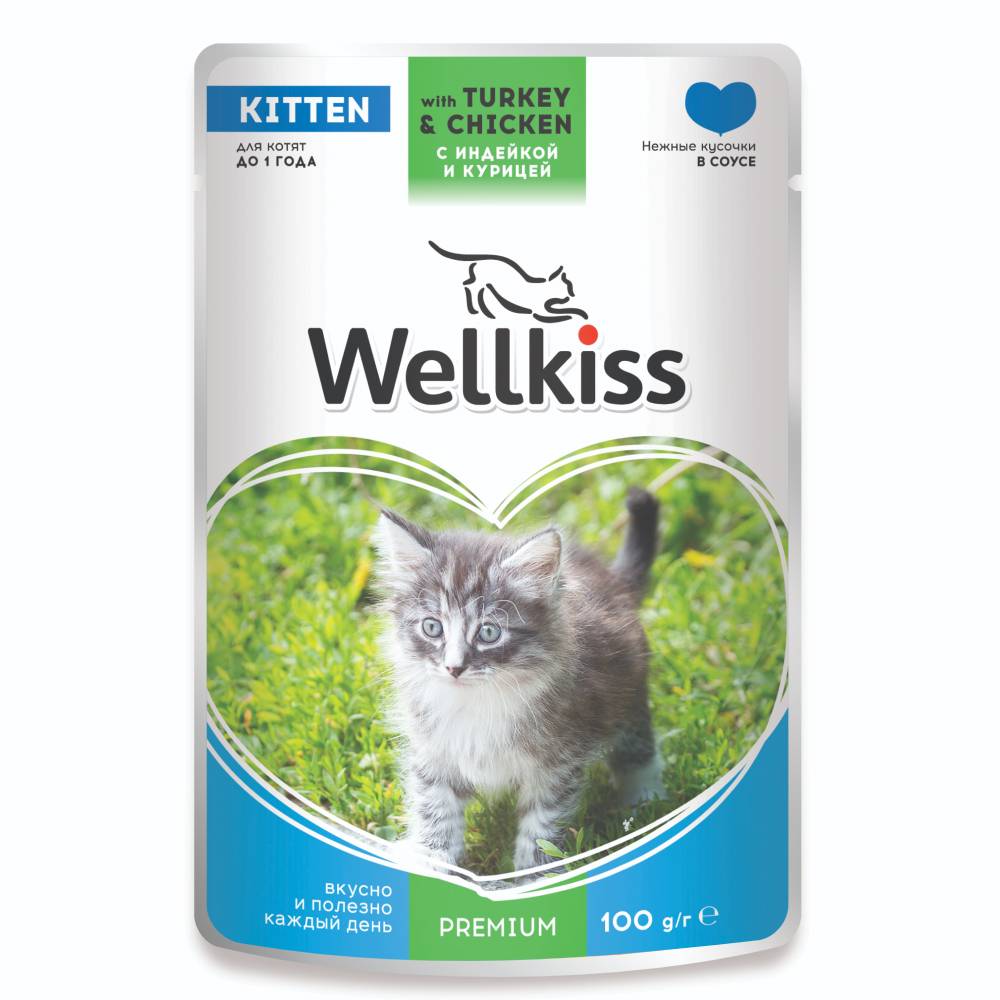 Корм для котят Wellkiss нежные кусочки индейка и курица — это изысканный корм для котят, который придется по вкусу даже самому привередливому питомцу. Нежные кусочки подарят вашему любимцу невероятное удовольствие, а комплекс витаминов и минералов способствует развитию, хорошему настроению и здоровой жизни кошки. WELLKISS — вкус и польза в одном пакетике.