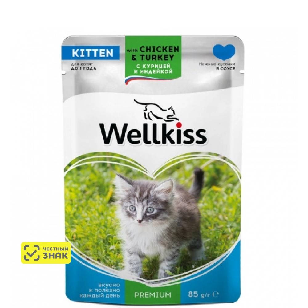 Корм для котят Wellkiss нежные кусочки индейка и курица – это изысканный корм для кошек, который придется по вкусу даже самому привередливому питомцу. Нежные кусочки подарят вашему любимцу невероятное удовольствие, а комплекс витаминов и минералов способствует развитию, хорошему настроению и здоровой жизни кошки. WELLKISS – вкус и польза в одном пакетике.