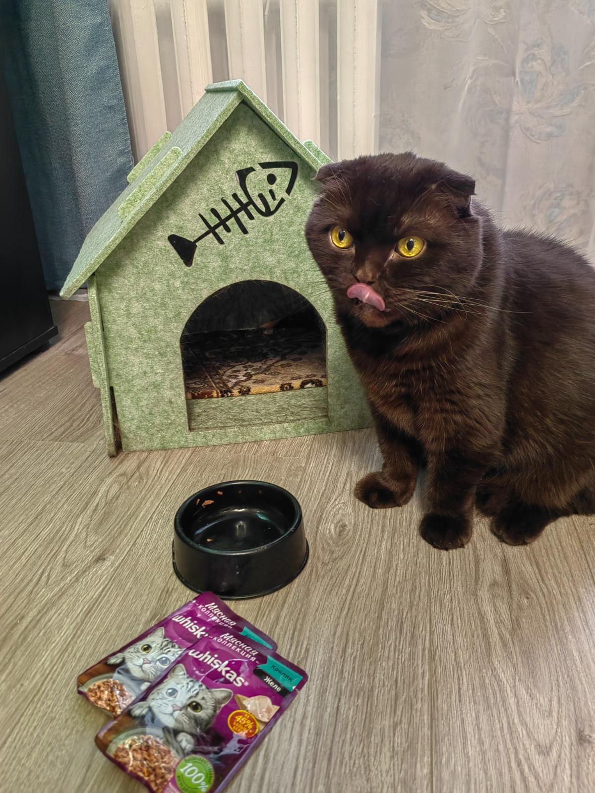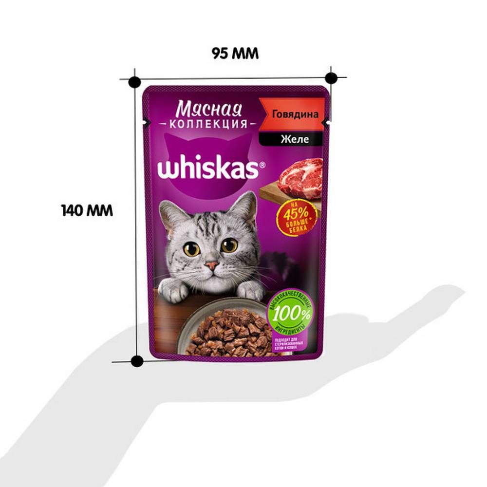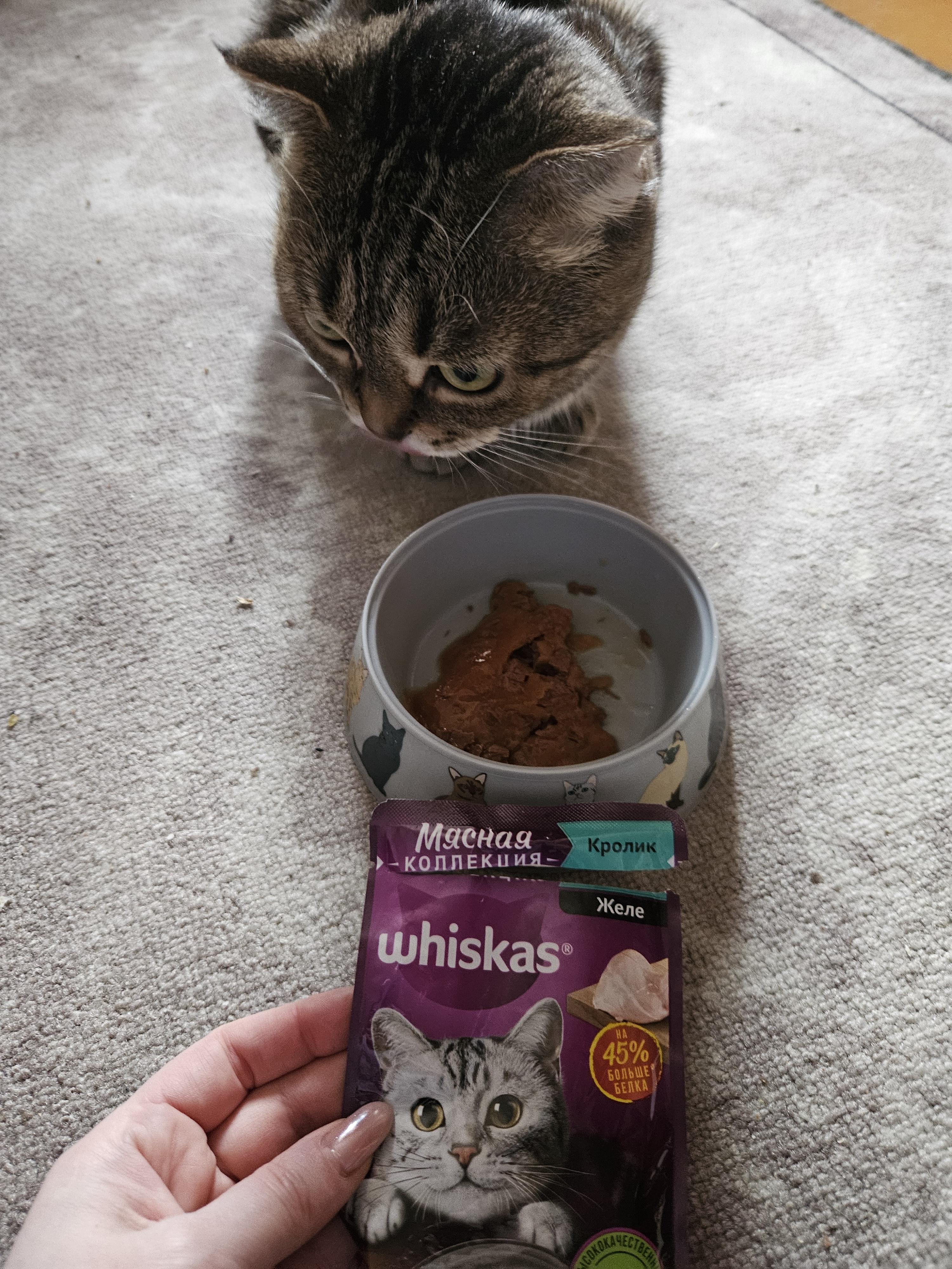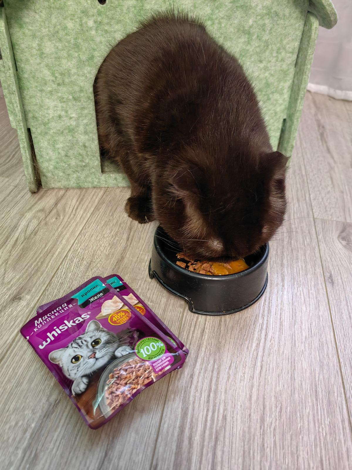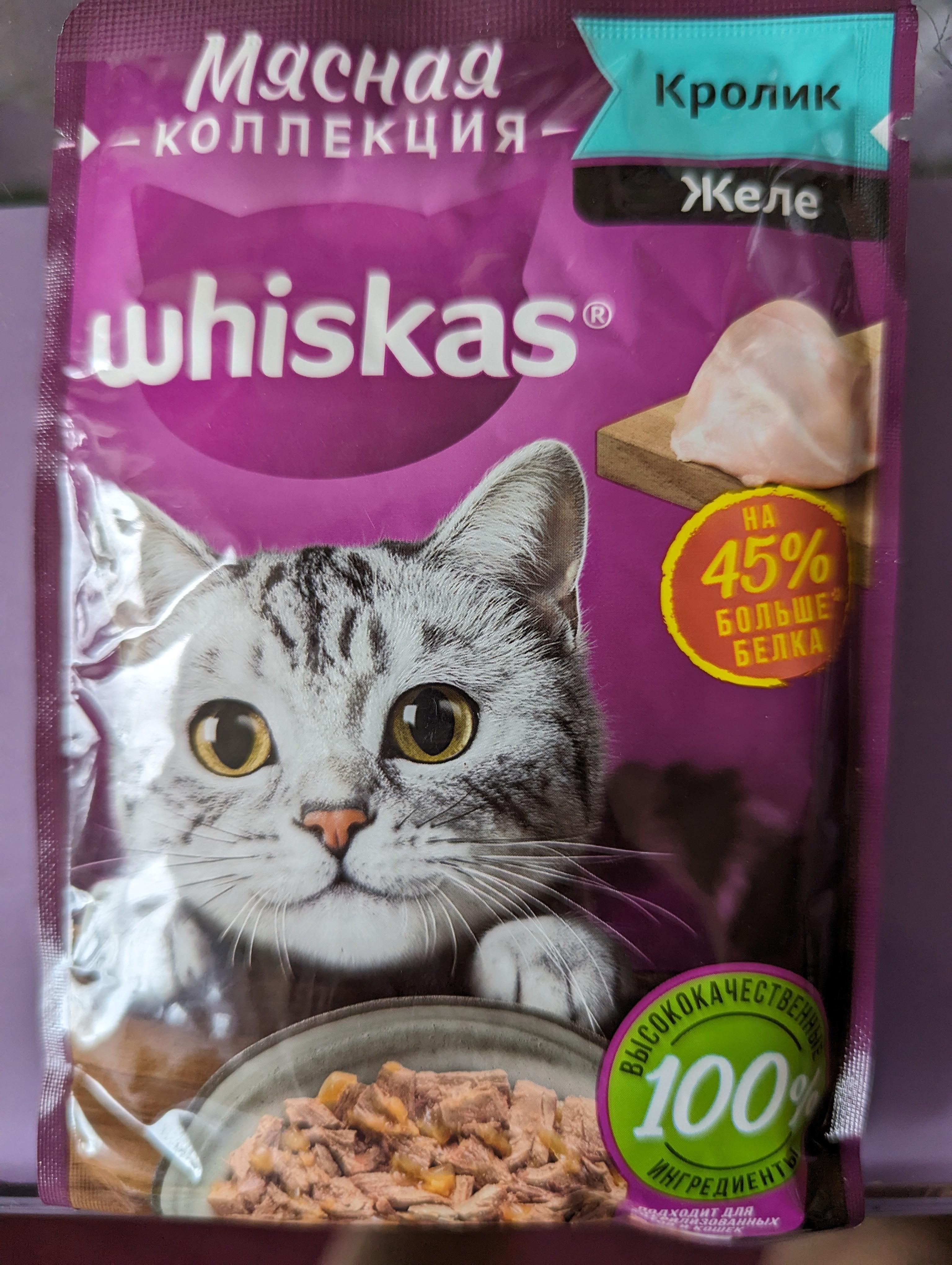 Коту 12 лет он очень избирательный в еде, поэтому приходится периодически менять корм. Решили попробовать новую мясную коллекцию Whiskas желе с кроликом.Комментарий