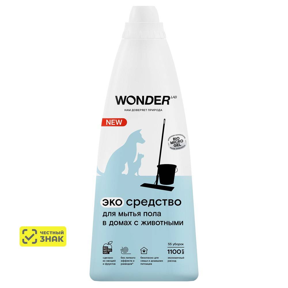- Концентрированное жидкое средство для пола и другие экосредства WONDER LAB созданы на основе инновационного компонента Biomicrogel®, который сделан из овощей и фруктов.