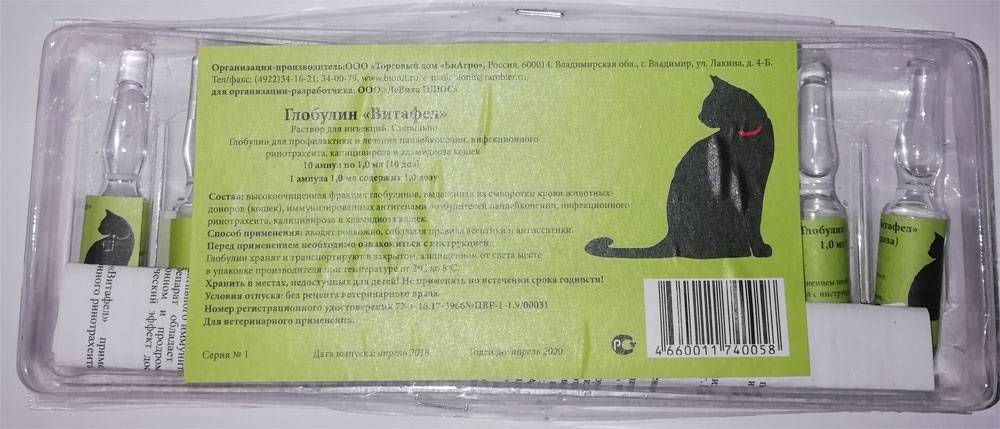 Для профилактики заражения панлейкопенией, инфекционным ринотрахеитом, калицивирозом и хламидиозом у непривитых домашних кошек и других животных семейства кошачьих глобулин Витафел применяют: в неблагополучных по указанным болезням питомниках для предотвращения заболевания клинически здоровых животных; перед посещением выставок и других массовых мероприятий, связанных с возможным контактом здоровых животных с больными; перед продажей или передачей котят или взрослых животных в другие питомники для предотвращения их возможного заражения; перед вязкой животных; окотившимся кошкам в неблагополучных питомниках для создания прочного колострального (полученного с молоком) иммунитета у котят; новорожденным котятам, полученным от непривитых, а также подозрительных по заболеванию кошек в неблагополучных питомниках. Для профилактики вирусных инфекций глобулин Витафел вводят животным подкожно в дозе 1 мл (1 доза) однократно или двукратно с интервалом 24 часа. По истечении срока формирования пассивного иммунитета для создания активного иммунитета проводят вакцинацию. С лечебной целью препарат применяют при подозрении в заражении указанными инфекциями. Наибольший терапевтический эффект достигается при применении препарата в начальной стадии болезни. Глобулин Витафел вводят животным подкожно в указанных дозах троекратно с интервалом 12 – 24 часа в зависимости от тяжести состояния животного. Возможно применение глобулина на фоне проведения симптоматического лечения, введения витаминов, антибиотиков и пробиотиков. При конъюнктивитах, вызванных герпесвирусами, калицивирусами и хламидиями, глобулин Витафел применяют в виде глазных капель: закапывание производят 2-3 раза в сутки по 1-3 капли в каждый глаз. При ринитах препарат закапывают в нос. Витафел глобулин может быть назначен животному независимо от его возраста и физиологического состояния (беременность, лактация и др.). При использовании глобулина Витафел необходимо соблюдать правила асептики и антисептики.