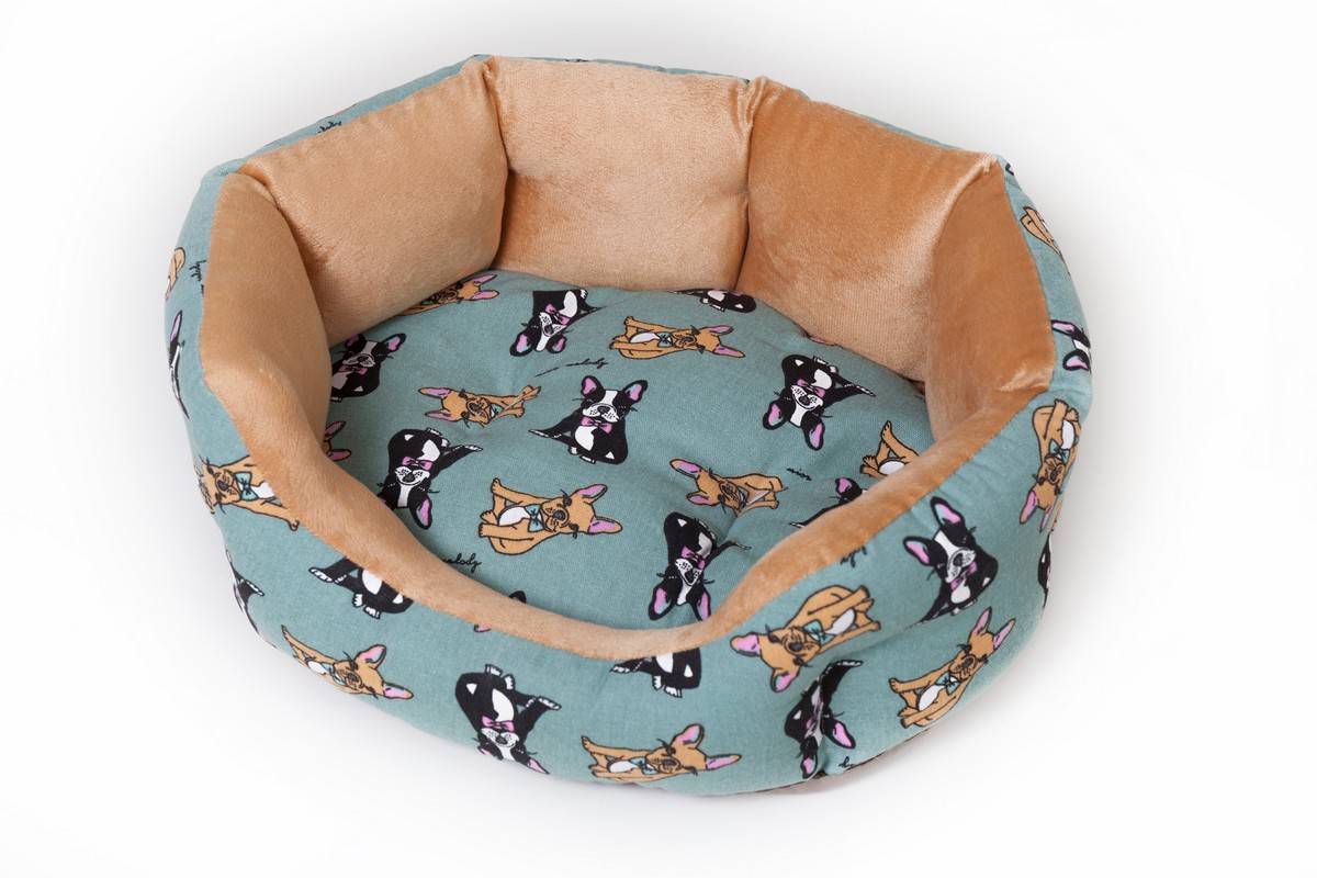 Зоофортуна Лежак Доги овальной формы. Преимущества: Оригинальный дизайн. Рисунок ткани в виде собачек. Высокий мягкий борт для защиты от сквозняка. Внутренняя отделка плюшевой тканью. Съемная подушка.
