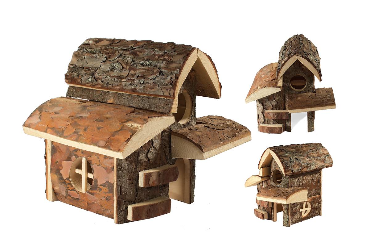 - Изготовлен из неокоренного дерева в виде строения из двух этажей с балконом.