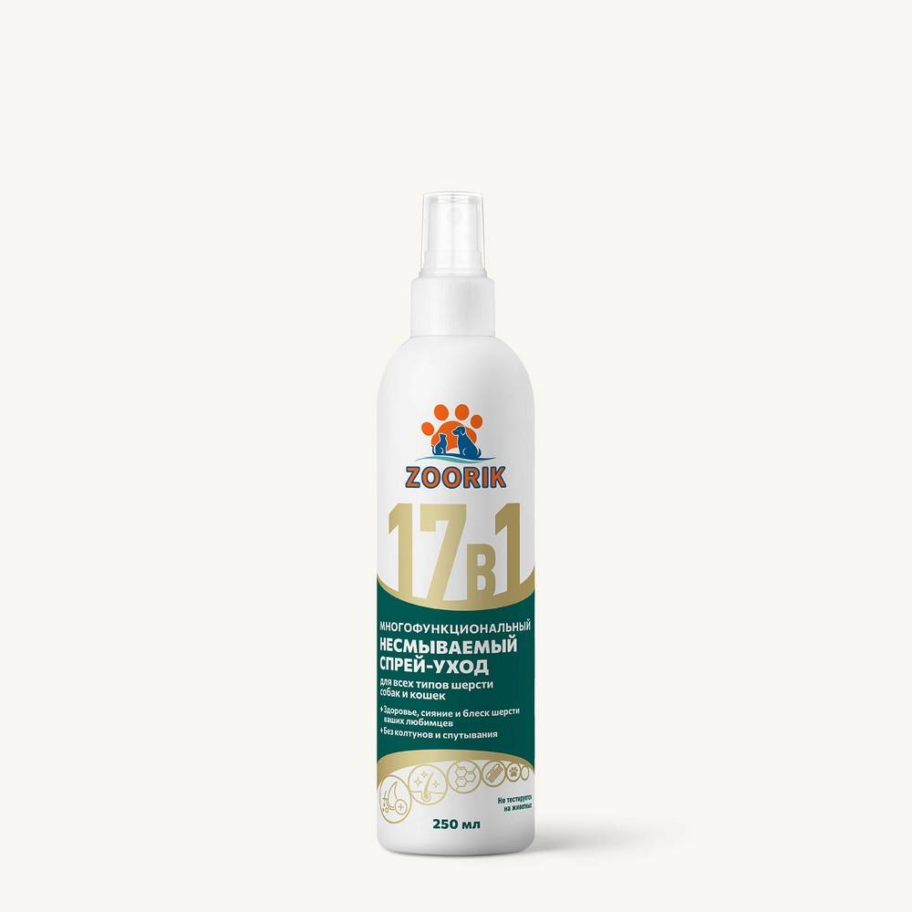 ZOORIK 17 в 1 — многофункциональный несмываемый спрей-уход для собак и кошек. Средство предназначено для комплексного ухода за шерстью питомца и подходит для всех типов шерсти.