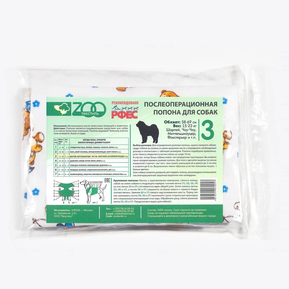 Послеоперационная попона для животных способствует быстрому заживлению послеоперационных ран, является защитой от разлизывания раны животным и препятствует загрязнению шва. Крепится на шее, на спине и за хвостом с помощью завязок, которые обеспечивают надежное крепление.