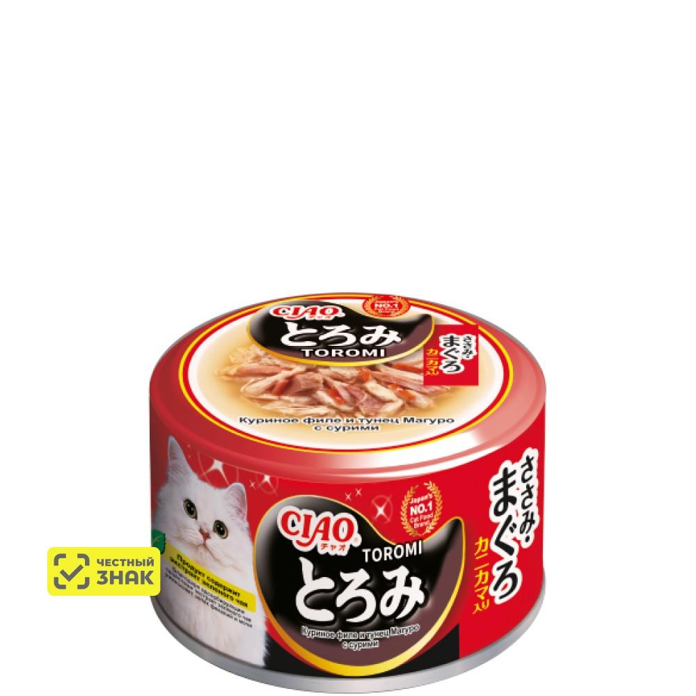 -20%5184 ₽229 ₽INABA CIAO Toromi Влажный корм (консервы) для кошек, куриное филе и тунец магуро со вкусом морского гребешка в бульоне, 80 гр.