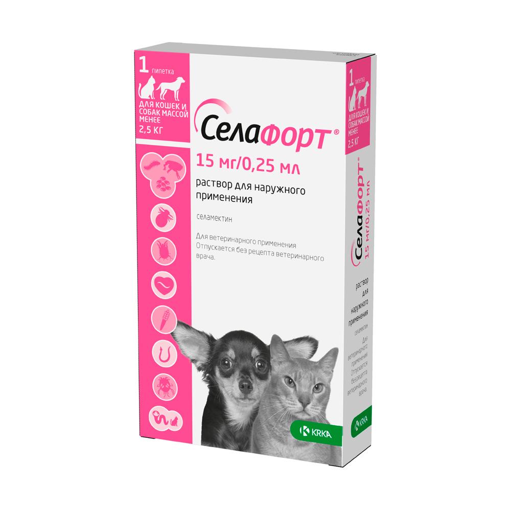 5785 ₽KRKA Селафорт Капли на холку для собак и кошек весом до 2,5 кг от блох, чесоточных клещей и гельминтов, 1 пипетка10-20кг2,6-5кг20-40кг5-10кгдо 2,5 кг