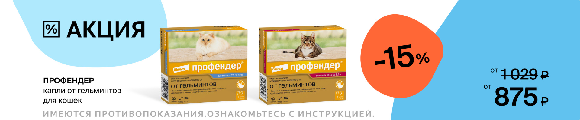 51 637 ₽Elanco Профендер Капли на холку от гельминтов для кошек от 5 до 8 кг, 2 пипетки по 1,12 млнет в наличии