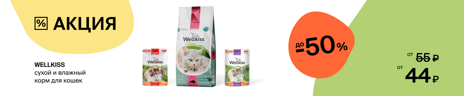 Wellkiss: до -50% на сухой и влажный корм для кошек